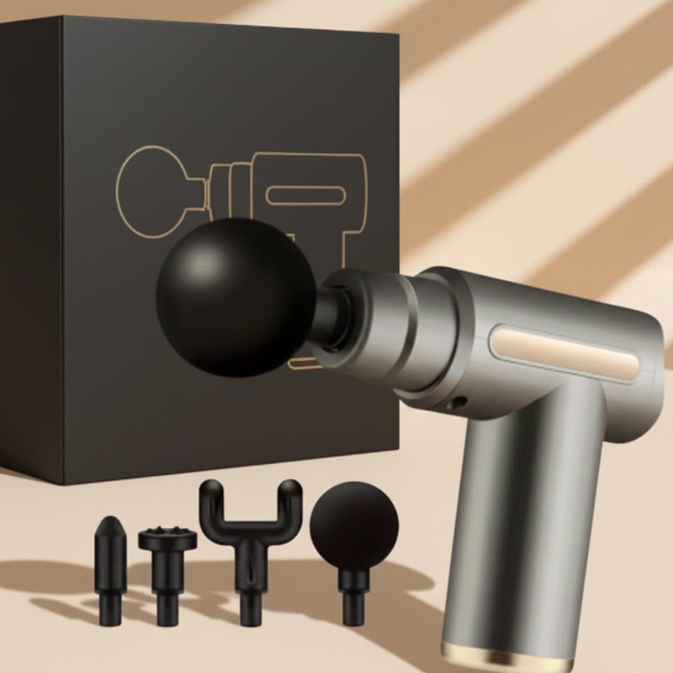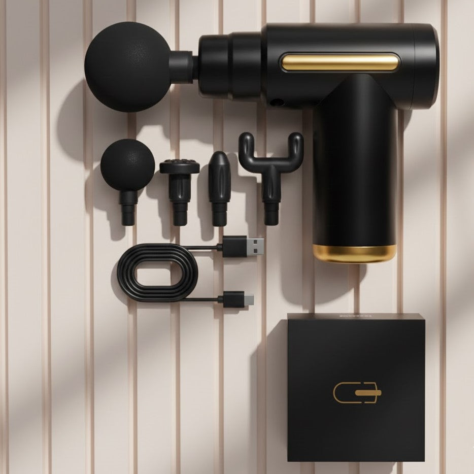A premium deep-tissue massage gun displayed beside its elegant black packaging box, accompanied by four interchangeable massage heads. The device features a sleek metallic design with ergonomic grip, showcasing its versatility for muscle relief, recovery, and full-body therapy.